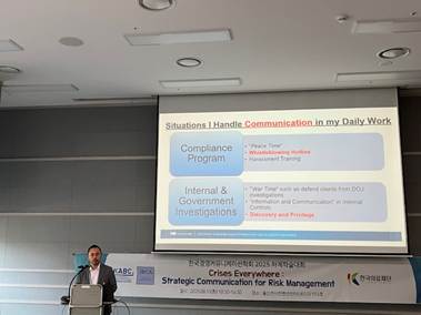今回の合同イベントでは、JBCA側の基調講演として、理事の結城大輔弁護士(のぞみ総合法律事務所)から、「Business Communication For Compliance and Risk Management ~ A Legal Practitioner’s Perspective」と題する発表があり、リスク情報についての内部通報制度による社内伝達の難しさや、米国訴訟における広範な証拠開示制度であるディスカバリに対応できない日本企業の社内コミュニケーションの例について解説されました。